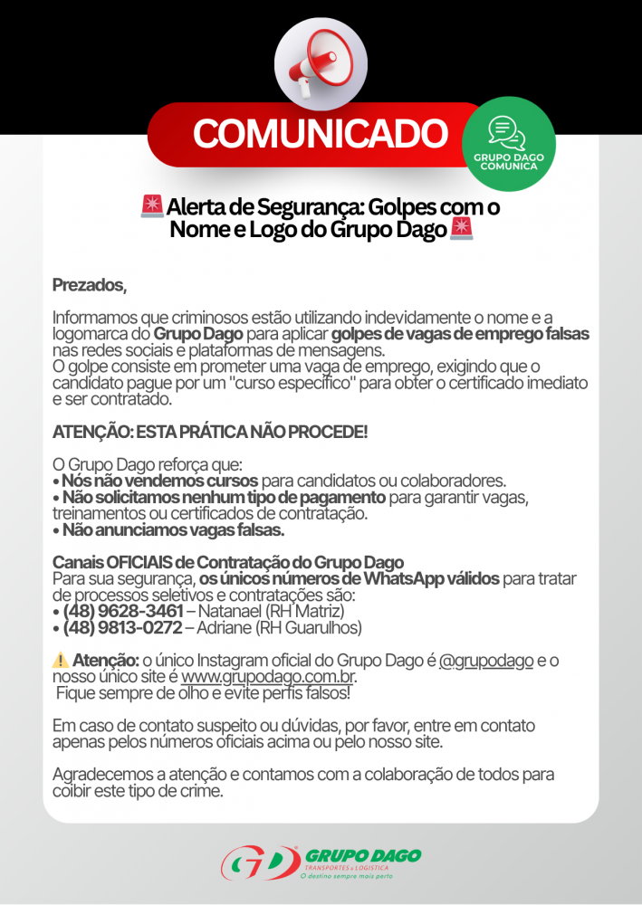 Golpistas estão utilizando indevidamente o nome e a logomarca do Grupo Dago para aplicar golpes com falsas promessas de emprego.